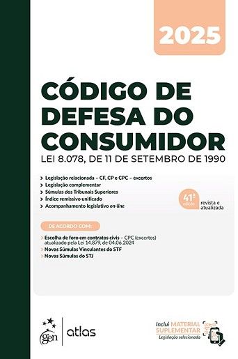 Este Código de Defesa do Consumidor consolida décadas de tradição do Grupo Editorial Nacional | Editora Atlas na publicação de livros jurídicos. Confiantes em superar os constantes desafios, entregamos ao público um material consistente, funcional e atualizado, com um projeto gráfico prático e moderno, que permite a otimização na busca de informações. Trata-se de legislação criteriosamente selecionada e organizada para atender a estudantes, candidatos a concursos públicos, técnicos e profissionais do Direito e das mais diversas áreas do conhecimento. Aos adquirentes desta edição do Código de Defesa do Consumidor, é oferecido material suplementar exclusivo e gratuito para download, com acesso via QR Code nas iniciais do livro. Além disso, o GEN disponibiliza para seus leitores um acompanhamento legislativo on-line, com informações sobre as normas de maior impacto nos principais ramos do Direito brasileiro, bem como aquelas que alterem os dispositivos legais contidos nesta obra, publicadas ao longo do ano.
