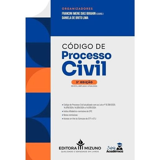 O Código de Processo Civil da Editora Mizuno oferece ao leitor um Código de Processo Civil atualizado com as últimas alterações legislativas. É compacto, mas com letra em tamanho adequado para a leitura. Contém índice sistemático e índice alfabético-remissivo que facilitam a localização do dispositivo legal. É perfeito para ser utilizado em provas, concursos e exames da OAB. O leitor poderá se manter informado sobre as mudanças na legislação no site: www.editoramizuno.com.br ?? Tópicos abordados Código de Processo Civil atualizado com as Leis nº 15.109/2025; 14.976/2024; 14.939/2024 e 14.879/2024 Índice Alfabético-remissivo do CPC Notas remissivas Acesso on-line às Súmulas do STF e STJ