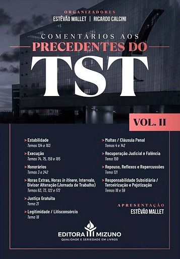 Tida como marco teórico e prático, indissociável ao conhecimento de todos aqueles profissionais que lidam diariamente com as relações trabalhistas e sindicais, esta inédita coletânea chega agora ao mercado reunindo prestigiados autores que trazem comentários aos atuais precedentes vinculativos do TST. Neste Volume II, também são abordadas controvérsias de grande relevância trabalhista e que incluem os seguintes assuntos: estabilidade (Temas 134 e 163); execução (Temas 74, 75, 159 e 185); honorários (Temas 3 e 242); jornada de trabalho (Temas 63, 73, 122 e 172); legitimidade e litisconsórcio (Tema 18); multas e cláusula penal (Temas 4 e 142); recuperação judicial e falência (Tema 159); repouso, reflexos e repercussões (Tema 121); e responsabilidade subsidiária, terceirização e pejotização (Temas 18 e 59). Reconhecido hoje por sua importância nacional, trata-se de projeto editorial que preenche o necessário conhecimento técnico-jurídico voltado à aplicação dos entendimentos vinculantes do Tribunal Superior do Trabalho, traduzindo-se numa ferramenta de consulta obrigatória para o cotidiano das relações laborais. ?? Tópicos Abordados EstabilidadeTemas 134 e 163 ExecuçãoTemas 74, 75, 159 e 185 HonoráriosTemas 3 e 242 Horas Extras, Horas in itinere, Intervalo,Divisor Alteração (Jornada de Trabalho)Temas 63, 73, 122 e 172 Justiça GratuitaTema 21 Legitimidade / LitisconsórcioTema 18 Multas / Cláusula PenalTemas 4 e 142 Recuperação Judicial e FalênciaTema 159 Repouso, Reflexos e RepercussõesTema 121 Responsabilidade Subsidiária /Terceirização e PejotizaçãoTemas 18 e 59