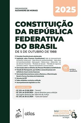 Esta Constituição da República Federativa do Brasil consolida cinco décadas de tradição do Grupo Editorial Nacional | Editora Atlas na publicação de livros jurídicos. Confiantes em superar os constantes desafios, entregamos ao público um material consistente, funcional e atualizado, com um projeto gráfico prático e moderno, que permite a otimização na busca de informações. Trata-se de legislação criteriosamente selecionada e organizada para atender a estudantes, candidatos a concursos públicos, técnicos e profissionais do Direito e das mais diversas áreas do conhecimento. Aos adquirentes desta 56ª edição da Constituição da República Federativa do Brasil, é oferecido material suplementar exclusivo e gratuito para download, com a íntegra das Emendas Constitucionais de Revisão e das Emendas Constitucionais de 1 a 135. Além disso, o GEN disponibiliza para seus leitores um acompanhamento legislativo on-line, com informações sobre as normas de maior impacto nos principais ramos do Direito brasileiro, bem como aquelas que alterem os dispositivos legais contidos nesta obra, publicadas ao longo do ano.