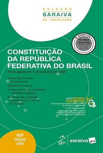 A Saraiva Jur, líder no mercado de livros jurídicos, apresenta a 60.ª edição da Constituição da República Federativa do Brasil. A obra traz a íntegra das Emendas Constitucionais, além de índices para facilitar a consulta: sistemático, cronológico, alfabético-remissivo da Constituição Federal e alfabético-remissivo do ADCT. Inclui material suplementar online com a Convenção Interamericana contra o Racismo, a Discriminação Racial e Formas Correlatas de Intolerância, a Convenção Internacional sobre os Direitos das Pessoas com Deficiência e o Tratado de Marraqueche. Últimas atualizações: EC n. 133, de 22-8-2024 Altera o art. 17 da Constituição Federal para impor aos partidos políticos a obrigatoriedade da aplicação de recursos financeiros para candidaturas de pessoas pretas e pardas EC n. 134, de 24-9-2024 Altera o art. 96 da Constituição Federal, para dispor sobre a eleição dos órgãos diretivos de Tribunais de Justiça EC n. 135, de 20-12-2024 Altera os arts. 37, 163, 165, 212-A e 239 da Constituição Federal e o Ato das Disposições Constitucionais Transitórias (ADCT) Súmulas Vinculantes 61 e 62