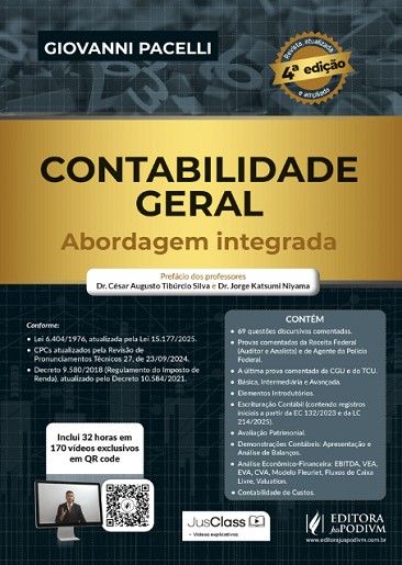 JusClass: Inclui acesso exclusivo à Plataforma JusClass – ambiente virtual de ensino da Editora Juspodivm Prefácio dos professores Dr. César Augusto Tibúrcio Silva e Dr. Jorge Katsumi Niyama CONFORME: Lei 6.404/1976, atualizada pela Lei 15.177/2025. CPCs atualizados pela Revisão de Pronunciamentos Técnicos 27, de 23/09/2024. Decreto 9.580/2018 (Regulamento do Imposto de Renda), atualizado pelo Decreto 10.584/2021. CONTÉM: 69 questões discursivas comentadas. Provas comentadas da Receita Federal (Auditor e Analista) e de Agente da Polícia Federal. A última prova comentada da CGU e do TCU. Básica, Intermediária e Avançada. Elementos Introdutórios. Escrituração Contábil (contendo registros iniciais a partir da EC 132/2023 e da LC 214/2025). Avaliação Patrimonial. Demonstrações Contábeis: Apresentação e Análise de Balanços. Análise Econômico-Financeira: EBITDA, VEA, EVA, CVA, Modelo Fleuriet, Fluxos de Caixa Livre, Valuation. Contabilidade de Custos. Inclui 32 horas em 170 vídeos exclusivos em QR code POR QUE ESCOLHER A OBRA CONTABILIDADE GERAL – ABORDAGEM INTEGRADA? O principal objetivo desta obra é apresentar a disciplina Contabilidade Geral com uma abordagem integrada para contadores e não contadores. A obra concilia a doutrina contábil com os principais normativos: Lei 6.404/1976 e os CPCs, propiciando uma visão sistêmica e integrada da matéria sem idas e vindas ao mesmo assunto. Para fins de organização do conteúdo, a obra foi dividida em 5 unidades didáticas: I Elementos Introdutórios; II Escrituração Contábil; III Avaliação Patrimonial; IV Demonstrações Contábeis: Apresentação e Análise de Balanços (inclusive Análise Econômico-Financeira); V Contabilidade de Custos. A obra contempla um conjunto inicial de questões objetivas e 68 questões discursivas (produto inédito no mercado na disciplina) e acompanha em QR Codes questões complementares de modo a manter os alunos sempre atualizados com a tendência das bancas. Fazem parte integral desta obra 170 vídeos disponíveis em QR Codes de forma gradual e progressiva contendo a visão do professor e autor sobre aquele tópico (normalmente os tópicos mais complexos). Esta obra atende a estudantes contadores (em especial que busca sucesso no Exame de Suficiência do CFC) e não contadores que buscam se preparar para concursos de alto nível no âmbito da União, Estados e Municípios. Atende também a profissionais da área contábil no âmbito da União, Estados e Municípios que busquem aumentar sua capacidade de análise sobre os eventos contábeis e sobre as demonstrações contábeis. Atende a alunos de graduação e pós-graduação que tenham como disciplina: Contabilidade Geral, Contabilidade Societária, Contabilidade Básica, Contabilidade Intermediária, Contabilidade Avançada, Análise de Balanços.