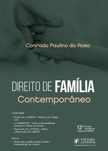 CONFORME:  Projeto de Lei 4/2025  Reforma do Código Civil  Lei 14.826/2024  Institui a parentalidade positiva e o direito ao brincar  Resolução CNJ 571/2024  Altera a Resolução CNJ 35/2007 INCLUI:  Esquemas e gráficos para auxiliar a compreensão da matéria POR QUE ESCOLHER O LIVRO DIREITO DE FAMÍLIA CONTEMPORÂNEO? O Direito de Família Contemporâneo que anuncio (como a badalar os sinos das catedrais) é um livro que nasce raro: aborda de forma estruturante o Direito das Famílias sem perder o DNA de seu autor, ou seja, a narrativa leve (que gera uma leitura sem cansaços), a sensibilidade poética na abordagem de temas relevantes (permitindo vislumbrar aspectos esconsos a olhos nus) e a criatividade no diálogo com outros aspectos da ciência (o que garante um resultado completo). Para além de tudo isso, o ritmo expositivo da obra se harmoniza com objetivos almejados pelo estudante (universitário e para concursos) e pelo profissional (que precisa de abordagem prática e direta). Vejo, com orgulho fraternal, que a minha intuição exulta por tamanha perspicácia. O jovem e provocador Conrado escreve o seu nome, para sempre, na galeria dos grandes juristas brasileiros, aliançando valores que evidenciam a maturidade das suas reflexões (fugindo do fácil argumento de que o afeto tudo justifica, sem técnica) e o compromisso com um sistema mais justo e solidário. E, fazendo jus à assertiva de Lulu Santos, de que “tudo muda, o tempo todo no mundo”, o livro apresenta uma nova feição para clássicos institutos jurídicos, como a curatela e o casamento, a partir do delineamento do Estatuto da Pessoa com Deficiência e das influências do novo Código de Processo Civil, demonstrando ser pioneiro e atual. Aqui, exsurgem, com cores, tons e matizes vibrantes, o ponto alto da obra e a mais saliente característica do autor: a preocupação em conceber um sistema de proteção para as pessoas humanas, consideradas em sua dignidade. Renovar a ciência do Direito das Famílias para maximizar proteção aos humanos, sem discriminações, respeitando a sua autonomia. Até porque há tanta vida lá fora e aqui dentro, sempre, como uma onda no mar (…). Cristiano Chaves de Farias