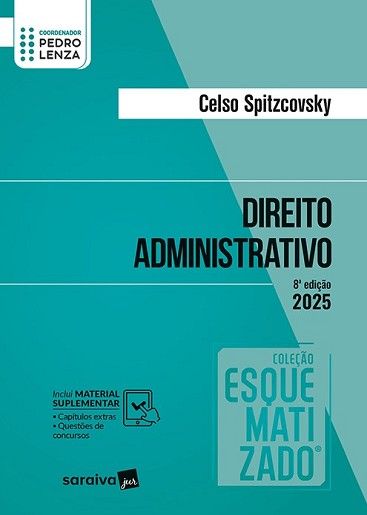A obra Direito Administrativo, da Coleção Esquematizado®, do autor Celso Spitzcovsky, com a coordenação de Professor Lenza, proporciona aos estudantes contato com a doutrina e jurisprudência, e permite que o leitor tenha acesso a mais completa e atualizada teoria. Com projeto gráfico especialmente pensado para otimizar a preparação dos alunos, a metodologia aplicada na obra proporciona ao leitor uma leitura mais dinâmica e estimulante, favorecendo a assimilação do conteúdo. Esta obra é essencial ao concurseiro que deseja conquistar a carreira pública e para todos que desejam compreender os institutos do Direito Administrativo. Para o direito administrativo, tivemos a honra de contar com o primoroso trabalho de Celso Spitzcovsky, que soube, com maestria, aplicar a metodologia Esquematizado à sua vasta e reconhecida trajetória profissional. Mestre em Direito do Estado pela PUC-SP, Professor de Direito Administrativo e Eleitoral no Damásio Educacional, Coordenador do curso de Pós-graduação lato sensu, em agentes públicos, da Legale Educacional, com larga experiência, advogado militante e palestrante nas áreas de Direito Constitucional, Administrativo e Eleitoral, Celso, sem dúvida, foi o nome mais que certo para essa importante e estratégica matéria. O Professor Damásio, com precisão, bem observava que este livro supera a sua função didática para apresentar ao Advogado, Juiz, Promotor, enfim, a todos os militantes da atividade administrativa, conhecimentos precisos e atualizados. (…) Estamos certos de que este livro será um valioso aliado para encurtar o caminho do ilustre e guerreiro concurseiro na busca do sonho dourado, além de ser uma ferramenta indispensável para estudantes de Direito e profissionais em suas atividades diárias. Pedro Lenza