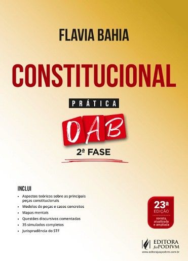 INCLUI: Aspectos teóricos sobre as principais peças constitucionais Modelos de peças e casos concretos Mapas mentais Questões discursivas comentadas 35 simulados completos Jurisprudência do STF POR QUE ESCOLHER A OBRA DIREITO CONSTITUCIONAL – 2ª FASE DA OAB? Os alunos sempre me incentivaram a escrever um livro de Constitucional para auxiliá-los no estudo teórico e prático para a elaboração da peça processual da 2ª Fase do Exame de Ordem. Finalmente, depois de completar 10 anos ministrando aulas nesse segmento peculiar, decidi reunir a experiência da docência e o incentivo dos alunos e elaborar um livro didático e objetivo, especialmente para os constitucionalistas da 2ª Fase do certame. A nossa obra traz a explicação teórica das principais peças processuais, casos concretos, modelos de peças, mapas mentais, questões discursivas comentadas pela banca, simulados e uma coletânea de decisões judiciais do STF, separadas por temas. Espero que este livro, feito com o mesmo carinho com que ministramos as nossas aulas, seja muito útil na preparação para a prova da aprovação. A Autora