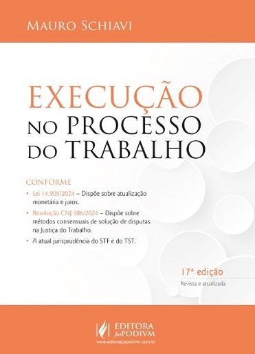 CONFORME: Lei 14.905/2024 – Dispõe sobre atualização monetária e juros. Resolução CNJ 586/2024 – Dispõe sobre métodos consensuais de solução de disputas na Justiça do Trabalho. Tema 1232 – Possibilidade de inclusão no polo passivo da lide, na fase de execução trabalhista, de empresa integrante de grupo econômico que não participou do processo de conhecimento. A atual jurisprudência do STF e do TST POR QUE ESCOLHER O LIVRO EXECUÇÃO NO PROCESSO DO TRABALHO? Embora a execução seja apontada como a fase mais difícil do processo, em que, muitas vezes, há um certo desencanto dos que nele atuam e também da doutrina, procuramos, além de realizar estudo dos institutos que compõem a execução, apontar alguns caminhos e soluções para a sua efetividade e celeridade. A importância da execução é vital para a efetividade do processo, pois de nada adianta todo o esforço judicial para declarar o direito na fase de conhecimento se ele não for materializado, entregando o bem da vida pretendido para o exequente. A obra apresenta moderna visão da execução no processo do trabalho, destacando seus institutos e peculiaridades, defendendo aplicação subsidiária do Código de Processo Civil quando mais efetivo que a CLT, sem deixar de lado, muitas vezes, a triste realidade das Varas do Trabalho, que apresentam milhares de processos nos quais milhares de trabalhadores aguardam a satisfação de seus créditos.