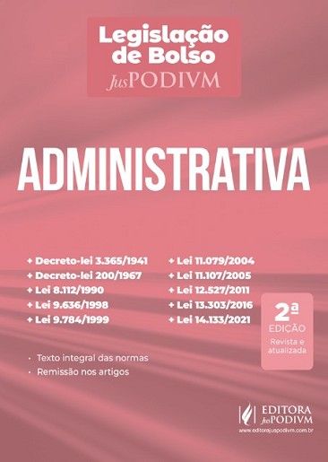 O LEITOR ENCONTRARÁ: Texto integral das normas: + Decreto-lei 3.365/1941 + Decreto-lei 200/1967 + Lei 8.112/1990 + Lei 9.636/1998 + Lei 9.784/1999 + Lei 11.079/2004 + Lei 11.107/2005 + Lei 12.527/2011 + Lei 13.303/2016 + Lei 14.133/2021 Remissões nos artigos POR QUE ESCOLHER O LIVRO “LEGISLAÇÃO DE BOLSO ADMINISTRATIVA”? A Editora Juspodivm, reafirmando seu compromisso em oferecer o melhor conteúdo no formato mais adequado a você, tem a satisfação de apresentar mais um produto adaptado às suas necessidades. A Coleção Legislação de Bolso foi pensada exclusivamente para sua comodidade no que diz respeito à consulta rápida à legislação básica no dia a dia. Desta forma, cada obra traz uma seleção dos principais códigos e, eventualmente, alguma norma complementar fundamental relacionada à matéria abordada, em formato reduzido para facilitar o manuseio e a portabilidade, mantendo a qualidade ea seriedade características da Legislação Juspodivm que você já conhece. Este volume conta com as seguintes normas: Decreto-lei 3.365/1941 (Desapropriação por Utilidade Pública), Decreto-lei 200/1967 (Organização da Administração Federal), Lei 8.112/1990 (Estatuto do Servidor Público), Lei 9.636/1998 (Bens imóveis da União), Lei 9.784/1999 (Lei do Processo Administrativo Federal), Lei 11.079/2004 (Parceria Público-privada), Lei 11.107/2005 (Consórcio Público), Lei 12.527/2011 (Lei de Acesso à Informação), Lei 13.303/2016 (Estatuto Jurídico das Empresas Estatais) e Lei 14.133/2021 (Lei de Licitações e Contratos Administrativos). As remissões são específicas e voltadas para os operadores desta área, com o objetivo de auxiliá-los na interconexão das normas. Para tornar a consulta mais dinâmica e didática, de maneira que o leitor perceba de imediato as alterações legislativas mais recentes, os dispositivos que sofreram atualização em 2024 e 2025 estão devidamente destacados. Com a publicação desta obra, reforçamos o compromisso de oferecer aos nossos leitores as melhores soluções editoriais para o seu dia a dia, seus estudos e seu bolso!. *Edição atualizada até 28.07.2025.