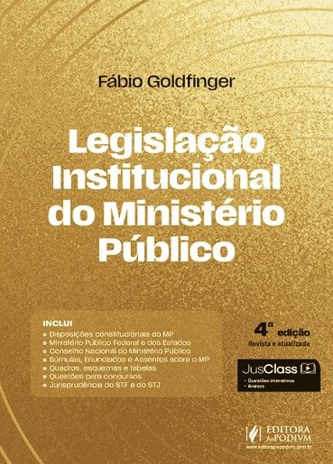 Acesso Exclusivo a plataforma digital da Editora Juspodivm – JusClass. CONFORME – Lei 8.625/1993 Lei Orgânica Nacional do Ministério Público (LONMP) – Lei Complementar 75/1993 Estatuto do Ministério Público da União – Resoluções do CNMP e do CNJ – Estatuto de Roma INCLUI – Disposições constitucionais do MP – Ministério Público Federal e dos Estados – Conselho Nacional do Ministério Público – Súmulas, Enunciados e Assentos sobre o MP – Quadros, esquemas e tabelas – Questões para concursos – Jurisprudência do STF e STJ POR QUE ESCOLHER O LIVRO LEGISLAÇÃO INSTITUCIONAL DO MINISTÉRIO PÚBLICO? É com enorme prazer que recebi o convite para prefaciar a 4ª edição do livro Legislação Institucional do Ministério Público, escrito pelo brilhante colega Promotor de Justiça Fábio Goldfinger. A força da escrita do autor já se impôs como realidade pelo fato de o livro alcançar a 4ª| edição, tendo sido lido e estudado por alunos e profissionais do Direito ao longo dos anos. Não há dúvida do potencial da obra para se tornar um texto clássico no conhecimento da Instituição do Ministério Público, que recebeu da Constituição Federal de 1988 a função de defensor dos direitos e garantias da cidadania brasileira. As conquistas da cidadania dos brasileiros neste período democrático de nossa história passam sem nenhuma dúvida pela atuação das Promotoras e dos Promotores de Justiça em todas as comarcas de nosso país. Conjugando forças com os ramos do Ministério Público da União, forma o Ministério Público brasileiro uma força viva na defesa dos Direitos Humanos e da dignidade da pessoa humana em toda a sua amplitude no Brasil. Fábio Goldfinger reúne o conhecimento teórico dos estudos acadêmicos necessários para a formulação das teses jurídicas com o conhecimento prático da atuação institucional, influenciando sobretudo a nova geração de membros do Ministério Público no estudo e na atuação profissional. Este livro, pela clareza da escrita, a didática das formulações e a precisão dos conceitos, é capaz de nortear também a todos aqueles que desejam se aprofundar no estudo e no conhecimento do Ministério Público e da atuação da Justiça brasileira. A obra em questão analisa a história do Ministério Público, os dispositivos constitucionais que levam à compreensão do trabalho institucional, a legislação do Ministério Público da União, dos Estados e do Distrito Federal, bem como o funcionamento do Conselho Nacional do Ministério Público, e, portanto, tem a abrangência necessária para todos aqueles que buscam o conhecimento, o aperfeiçoamento e a reflexão dos importantes temas sobre a Instituição do Ministério Público aqui tratados. A atualização efetuada para esta 4ª edição da obra a torna indispensável para todos os estudiosos do Direito e das Instituições brasileiras. Uma excelente leitura a todos! Gianpaolo Poggio Smanio Procurador de Justiça do Ministério Público de São Paulo. Procurador Geral nos biênios 2016-2018 e 2018-2020. Professor Titular da Universidade Presbiteriana Mackenzie.