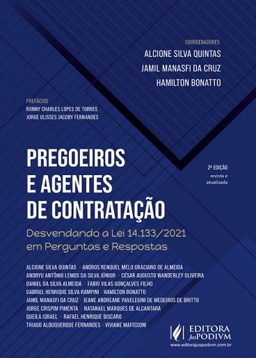 Prefácios: • Ronny Charles Lopes de Torres • Jorge Ulisses Jacoby Fernandes POR QUE ESCOLHER O LIVRO “PREGOEIROS E AGENTES DE CONTRATAÇÃO”? Os autores, com vasta experiência na área, desdobram-se não apenas em apresentar os aspectos técnicos da legislação, mas em elucidar as suas implicações no dia a dia dos pregoeiros e agentes de contratação. Cada conteúdo é cuidadosamente desenhado para abordar os temas mais relevantes e complexos da lei, fornecendo claridade e direção para os profissionais da área. Este livro destaca-se por sua abordagem pragmática e aplicada. Em vez de se restringir a uma exposição teórica, os autores optam por um caminho interativo, permitindo que o leitor fique engajado ao material de forma ativa. As perguntas formuladas refletem dúvidas reais surgidas na prática profissional, enquanto as respostas fornecem não apenas a informação legal necessária, mas também dicas práticas, exemplos e recomendações que somente a experiência de campo pode oferecer. Convidamos a todos os estudantes, professores, profissionais e entusiastas do direito administrativo e das licitações públicas a mergulharem nessa leitura enriquecedora que promete desvendar os mistérios da Lei 14.133/2021 e equipar seus leitores com o conhecimento necessário para enfrentar os desafios que a nova legislação apresenta. Os Coordenadores