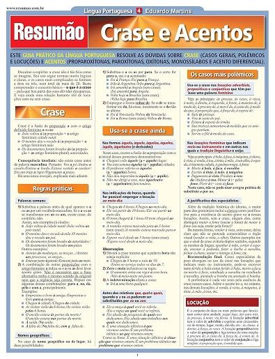 Regras gerais do uso da crase. Palavras comuns. Nomes geográficos. Uso obrigatório e casos mais polêmicos. Quando não se usa a crase. O uso facultativo da crase. O teste da crase. Locuções com e sem crase e uma relação que elimina a dúvida sobre o emprego ou não da crase, com mais de 250 expressões. Acentos: proparoxítonas, paroxítonas, oxítonas, monossílabos. Encontro de vogais, i e u dos hiatos. Acento diferencial. Acento grave. Abreviaturas. Nomes próprios. Palavras sem acento. Atualizado com as novas regras de ortografia.
