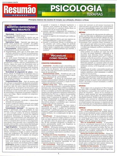Os princípios básicos das escolas de terapia, sua utilização, sua eficácia e críticas. O Resumão começa abordando as questões enfrentadas pelo terapeuta. Na sequência, as informações essenciais de várias escolas: psicanálise, terapia racional emotiva comportamental, terapia existencial, terapia da realidade, humanística, comportamental, Gestalt e terapia familiar sistêmica, entre outras.