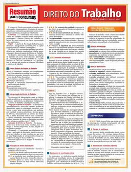 O Resumão aborda os principais conceitos do Direito do Trabalho com foco nos concursos públicos. Relação de trabalho e relação de emprego, empregado, empregador, terceirização, contrato de trabalho, duração do trabalho, férias, remuneração e salário, extinção do contrato, estabilidade, FGTS, trabalho da mulher, trabalho do menor, segurança e saúde, prescrição e decadência, direito coletivo de trabalho e direito de greve são os temas elencados.