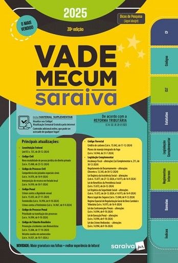 O Vade Mecum Saraiva está de volta — de cara nova, melhor e ainda mais atualizado! Apresentamos a 39ª edição do renomado Vade Mecum Saraiva, líder absoluto em vendas no mercado jurídico brasileiro por mais de 15 anos. Esta edição chega com formato (18X27), maior gramatura nas folhas e textura suave, garantindo clareza, durabilidade e conforto visual, elementos essenciais para horas de estudo. Fica mais fácil fazer marcações e folhear o Vade sem danificá-lo. Confira por que o Vade Mecum Saraiva é o preferido dos alunos e profissionais de Direito: – Legislação revista e atualizada a cada edição (ele reúne as normas mais importantes do ordenamento jurídico) – tudo selecionado com base na grade curricular das principais faculdades de Direito e em editais de concursos para carreiras jurídicas; – Estrutura – divisões e tarjas que facilitam a localização de qualquer norma buscada, fonte maior nas partes da Constituição Federal, Códigos e CLT; – Notas remissivas e índices – são várias correlações entre as matérias e índices multifuncionais, que ajudarão você a rapidamente pesquisar por assunto, ordem alfabética, cronológica, pelo número do diploma ou por seu tema; – Dicas de pesquisa (legal design) – tutorial nas páginas iniciais sobre como consultar a legislação e manusear seu Vade Mecum. – Ambiente de aprendizagem – acesso online e gratuito à plataforma de conteúdos complementares ao livro, na qual você terá disponível: – Legislação adicional – diplomas que completam o extenso conteúdo; impresso da obra, para você consultar em qualquer lugar; – Serviço Atualize seu Código – atualização semanal de todo o conteúdo impresso. Tradição, organização e estrutura, aliadas à referência da SaraivaJur: isso é o Vade Mecum Saraiva. Principais Atualizações da 39.ª edição: Atualizada de acordo com a Reforma Tributária! Constituição Federal (até EC n. 135, de 20-12-2024) Código Civil Nova modalidade de pessoa jurídica de direito privado (Lei n. 15.068, de 23-12-2024) Código de Processo Civil Competência dos juizados especiais cíveis (Lei n. 14.976, de 18-9-2024) Interposição de recurso em feriado local (Lei n. 14.939, de 30-7-2024) Código Penal Crimes contra a dignidade sexual (Lei n. 15.035, de 27-11-2024) Feminicídio (Lei n. 14.994, de 9-10-2024) Crimes contra o Patrimônio (Lei n. 14.967, de 9-9-2024) Código de Processo Penal Prioridade na tramitação dos processos (Lei n. 14.994, de 9-10-2024) Código de Trânsito Brasileiro Prevenção a Acidentes com Motociclistas (Lei n. 15.006, de 17-10-2024) Veículos usados em autoescolas (Lei n. 14.921, de 10-7-2024.) Código Florestal Crédito de carbono (Lei n. 15.042, de 11-12-2024) Planos de manejo integrado do fogo (Lei n. 14.944, de 31-7-2024) – Legislação Complementar Arcabouço Fiscal – alterações (Lei Complementar n. 211, de 30-12-2024) Regulamento do Desarmamento – alterações (Decreto n. 12.345, de 30-12-2024) Lei Orgânica da Assistência Social– alterações (Leis n. 15.077, de 27-12-2024, e 14.973, de 16-9-2024) Lei de Benefícios da Previdência Social (Lei n. 15.072, de 26-12-2024) Lei Orgânica da Seguridade Social– alterações (Leis n. 15.072, de 26-12-2024, e 14.973, de 16-9-2024) Marco Legal dos Seguros (Lei n. 15.040, de 9-12-2024) Regime Especial de Regularização Geral de Bens Cambial e Tributária (Lei n. 14.973, de 16-9-2024) Lei das Contravenções Penais– alterações (Lei n. 14.994, de 9-10-2024) Lei de Execução Penal – alterações (Lei n. 14.994, de 9-10-2024) Lei dos Crimes Hediondos – alterações (Lei n. 14.994, de 9-10-2024)