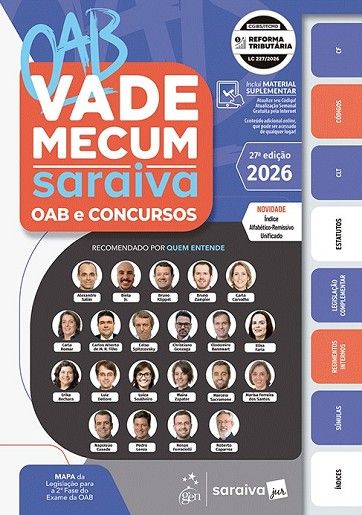 Esta obra é um sucesso de vendas! Indicada para OAB. Todo estudante do curso de direito, ao seu término, precisa prestar o Exame da OAB para exercer a profissão. É um verdadeiro desafio para ele! Esse exame é composto por duas fases: na 1.ª, o aluno não pode consultar material algum e responde questões objetivas, mas, na 2.ª fase, que é prática, discursiva e voltada para uma área específica do direito escolhida por ele, pode haver consulta a material que contenha apenas legislação. Sendo assim, estruturamos o livro para uma rápida consulta na hora da prova. Além disso, constitui material essencial para preparação e utilização também na graduação e em concursos públicos. Alguns diferenciais são de grande ajuda para o aluno (e totalmente permitidos pela OAB para uso em prova): – NOVIDADE: Adendo especial com os Precedentes qualificados dos Tribunais Superiores: Precedentes Qualificados do STF – Repercussão Geral Precedentes Qualificados do STJ – Recursos Repetitivos Incidentes de Assunção de Competência do STJ Precedentes Vinculantes do TST – Recursos de Revista Repetitivos Incidentes de Assunção de Competência do TST Incidentes de Resolução de Demandas Repetitivas do TST – Indice alfabético-remissivo unificado incluindo verbetes para CF, Códigos, CLT, Estatutos e Legislação Complementar; – MAPA da Legislação: Guia de localização rápida, para a 2.ª fase do Exame da OAB, das principais leis e decretos para cada área escolhida pelos alunos; – Regimento Interno do STF e do STJ (divisão exclusiva = agilidade na pesquisa); – Súmulas do Conselho Federal da OAB. Últimas atualizações: Atualizada de acordo com a Regulamentação da Reforma Tributária! Constituição Federal (até EC n. 138, de 19-12-2025) Código de Processo Civil Dispensa o advogado da antecipação de custas processuais em ações de cobrança e em execuções de honorários advocatícios (Lei n. 15.109, de 13-3-2025) Código Penal Inaplicabilidade da extinção de punibilidade ao devedor contumaz (Lei Complementar n. 225, de 8-1-2026) Crimes contra a dignidade sexual – modificação das penas (Lei n. 15.280, de 5-12-2025) Crime de associação criminosa (Lei n. 15.245, de 29-10-2025) Estelionato contra pessoa com deficiência (Lei n. 15.229, de 2-10-2025) Crimes de furto, roubo e receptação de fios, cabos ou equipamentos utilizados para fornecimento de energia elétrica – modificação das penas (Lei n. 15.181, de 28-7-2025) Código de Processo Penal Medidas protetivas de urgência (Lei n. 15.280, de 5-12-2025) Conversão da prisão em flagrante em preventiva (Lei n. 15.272, de 26-11-2025) Código Tributário Nacional Imposto sobre a Transmissão Inter vivos (Lei Complementar n. 227, de 13-1-2026) Código de Trânsito Brasileiro Carteira Nacional de Habilitação (Medida Provisória n. 1.327, de 9-12-2025) CÓDIGO DE DEFESA DO CONTRIBUINTE (Lei Complementar n. 225, de 8-1-2026) CLT Licença-maternidade (Lei n. 15.222, de 29-9-2025) Transferência de empregado público (Lei n. 15.175, de 23-7-2025) Legislação Complementar Comitê Gestor do IBS – Reforma Tributária (Lei Complementar n. 227, de 13-1-2026) Estatuto da Microempresa e da Empresa de Pequeno Porte – alterações (Leis Complementares n. 227, de 13-1-2026, e n. 216, de 28-7-2025) IBS, CBS e IS – alterações (Lei Complementar n. 227, de 13-1-2026) Lei de Responsabilidade Fiscal – alterações (Lei Complementar n. 224, de 26-12-2025) Lei de Execução Penal – alterações (Leis n. 15.295, de 19-12-2025 e n. 15.280, de 5-12-2025) Estatuto da Criança e do Adolescente – alterações (Leis n. 15.280, de 5-12-2025, n. 15.268, de 21-11-2025, n. 15.243, de 28-10-2025, n. 15.240, de 28-10-2025 e n. 15.234, de 7-10-2025) Estatuto da Pessoa com Deficiência – alterações (Leis n. 15.280, de 5-12-2025, e n. 15.249, de 3-11-2025) Lei de Licitações – alterações (Leis n. 15.266, de 21-11-2025, e n. 15.210, de 16-9-2025) Direitos dos usuários de serviços financeiros (Lei n. 15.252, de 4-11-2025) Estatuto Digital da Criança e do Adolescente (Lei n. 15.211, de 17-9-2025) Lei Geral do Licenciamento Ambiental (Lei n. 15.190, de 8-8-2025)